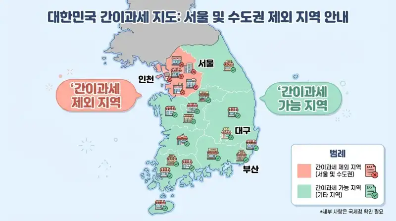 배제업종보다 더 억울한 게 배제지역이에요. 서울·광역시·수도권 일부 지역에서 골프연습장, 주유소, 예식장, 귀금속 판매, 피아노 판매, 가구 대리점 등을 운영하면 매출과 무관하게 일반과세자가 됩니다. 게다가 각 지역 세무서별로 특정 건물이나 도로변을 간이과세 배제지역으로 별도 고시하고 있어서, 사업장 주소만으로 간이과세 여부가 갈리기도 해요.