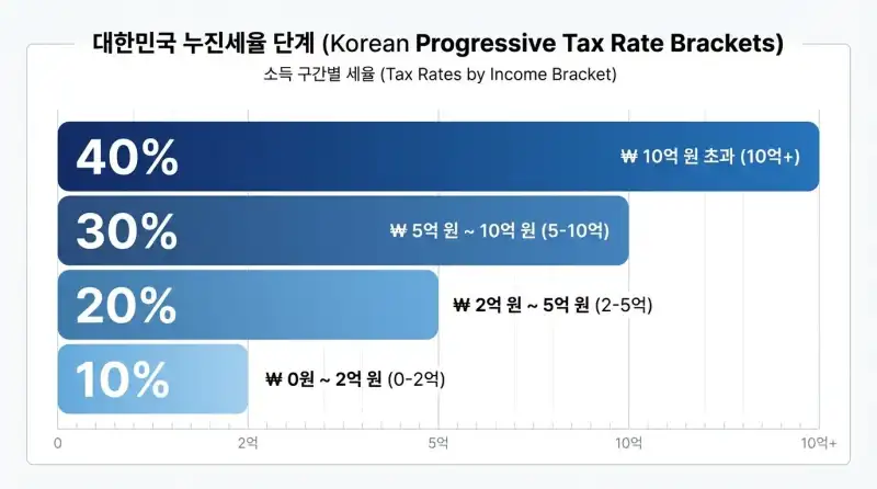 바뀐 세율표를 정리하면 이래요. 과세표준 2억 원 이하는 10%, 2억 초과~5억 이하는 20%(누진공제 1천만 원), 5억 초과~10억 이하는 30%(누진공제 6천만 원), 10억 초과는 40%(누진공제 1억 6천만 원)이에요. 기존 5단계에서 4단계로 줄었고, 전체적으로 세 부담이 낮아진 방향이에요.