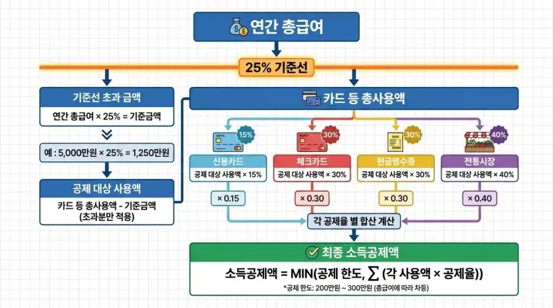 소득공제의 출발점은 “총급여의 25%”입니다. 이걸 넘어야 공제가 시작돼요. 연봉 4,000만 원이면 1,000만 원을 써야 비로소 공제 대상 금액이 생기는 구조거든요. 25% 아래 구간은 신용카드를 쓰든 현금영수증을 발급받든 공제액은 0원이에요.